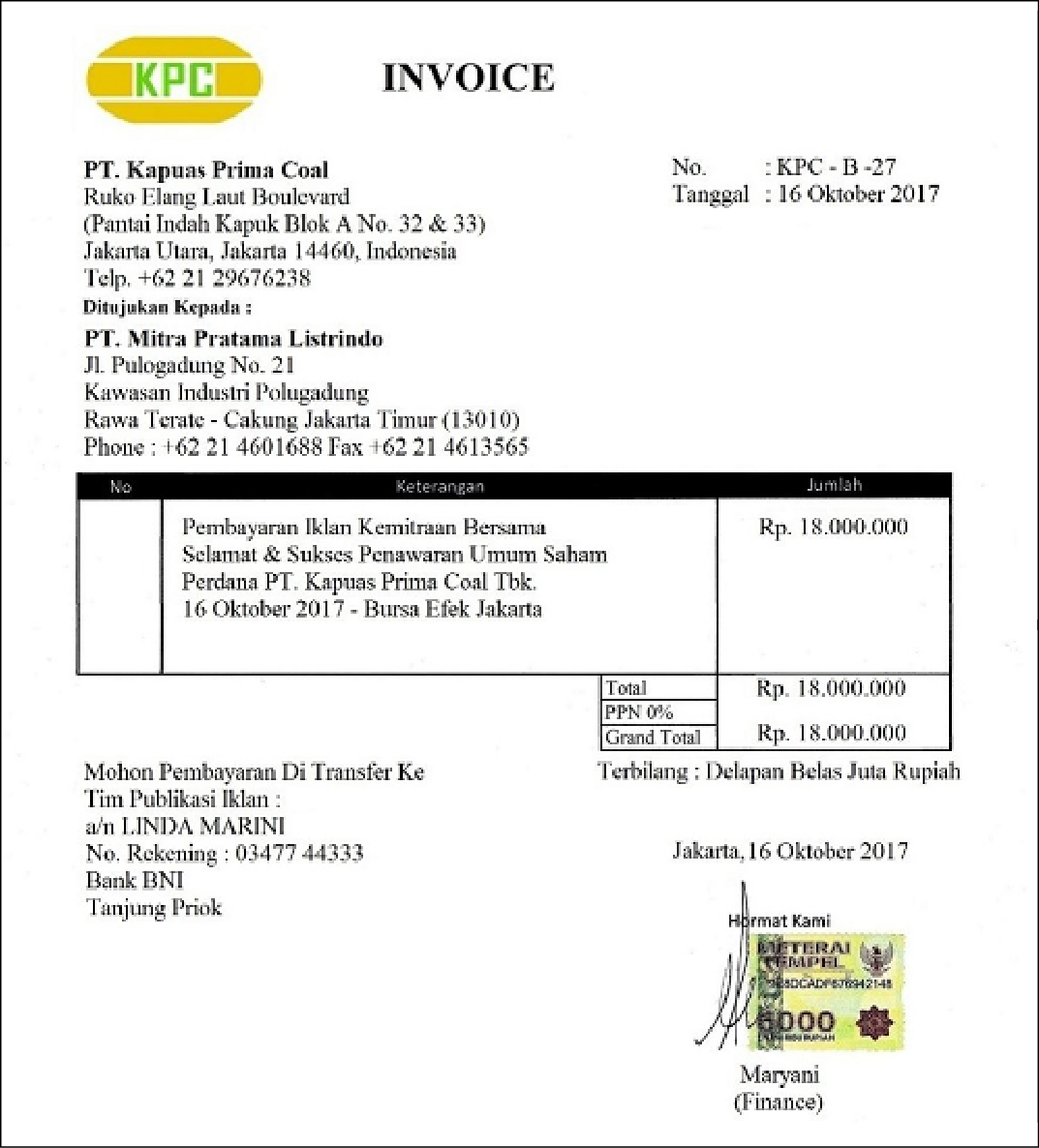 Berikut kami sampaikan jika ada menerima email tagihan atau telepon tagihan atas pemasangan iklan yang minta ditransfer selain ke rekening Bpk. Sim Antony, mohon agar dikonfirmasi ke Corporate Secretary PT.KPC (Bpk. Lucky Tajo) karena ada kemungkinan adalah kasus PENIPUAN. Berikut terlampir contoh invoice palsu yang sudah beredar. Terima kasih.