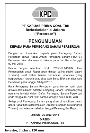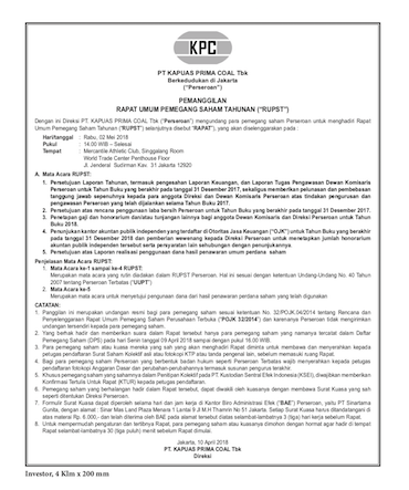 Dengan ini Direksi PT. KAPUAS PRIMA COAL Tbk (“Perseroan”) mengundang para pemegang saham Perseroan untuk menghadiri Rapat Umum Pemegang Saham Tahunan (“RUPST”) selanjutnya disebut “RAPAT”), yang akan diselenggarakan pada Rabu, 02 Mei 2018. Klik link dibawah untuk detil lengkap nya.