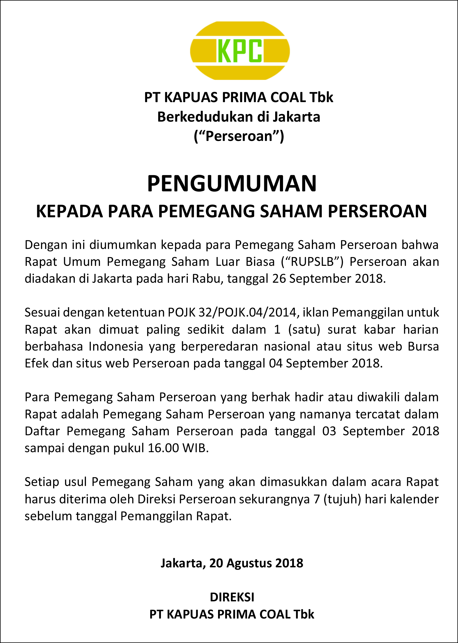 Dengan ini Direksi PT. KAPUAS PRIMA COAL Tbk (“Perseroan”) mengundang para pemegang saham Perseroan untuk menghadiri Rapat Umum Pemegang Saham Luar Biasa (“RUPSLB”) selanjutnya disebut “RAPAT”), yang akan diselenggarakan pada Rabu, 26 September 2018. Klik link dibawah untuk detil lengkap nya.